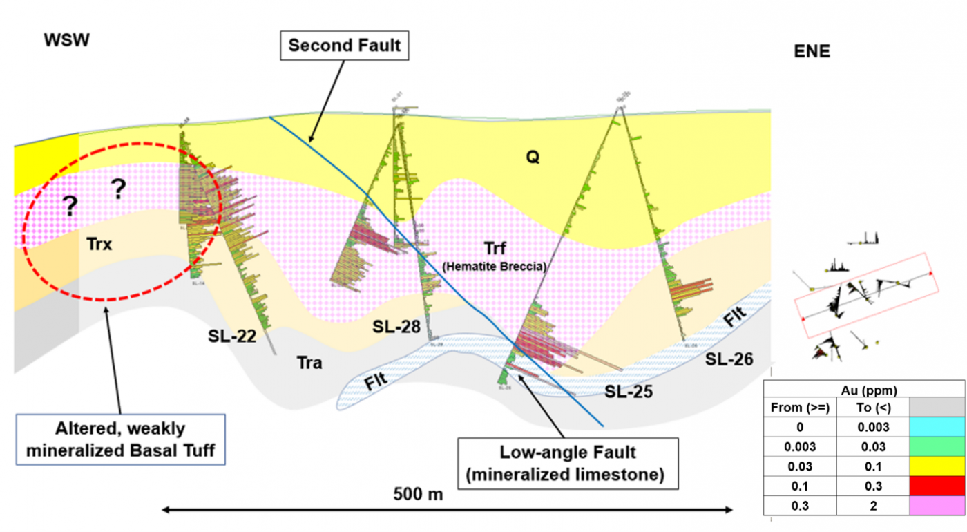 Most of the gold mineralization occurs in hematite breccia (Trf) and the underlying silicified lithic tuff zone (Trx), gold values can increase when intercepted by quartz veining. Important to know that drilling has also encountered displaced decalcified, gold-bearing (up to 0.64 g/t Au) carbonate rock in low-angle structures, which suggests that there can be more targets within the area as expected!