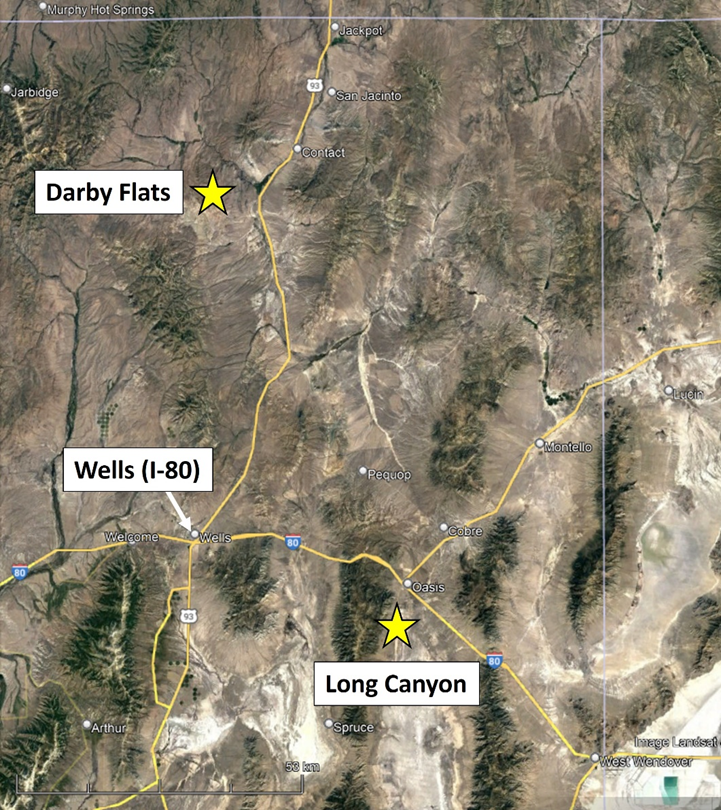 The Darby Flats Gold Project is located in Elko County approximately 65.2 km (40.5 miles) north of Wells in northeastern Nevada (see Figure 1). The Property, comprising 6 unpatented mining claims, is 100%-owned by NV Gold. Limited historical drilling conducted by AngloGold encountered 33.5 meters (110 feet) of anomalous gold and values up to 0.24 g/t Au accompanied by other pathfinder elements (Arsenic to 167 ppm and mercury up to 8.5 ppm). Only two drill holes have tested the Darby Flats target to date!
