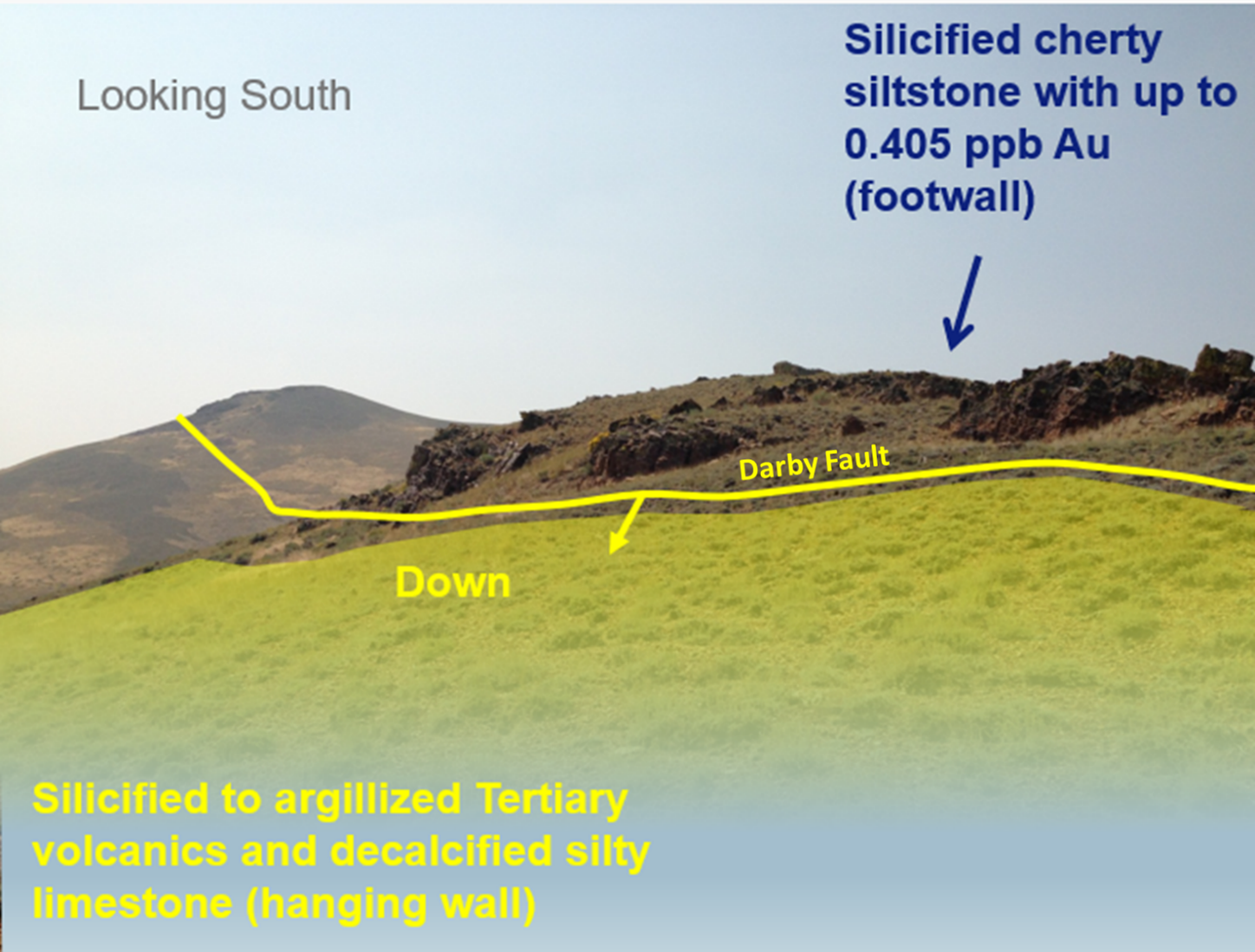 • Exposed rock types: Silicified, gold-anomalous cherty siltstone footwall to Darby Fault, and argillized, pyritic Tertiary volcanics and decalcified silty limestone, high in mercury (8.5 ppm), hanging wall to fault (see Figure 2 & 3).