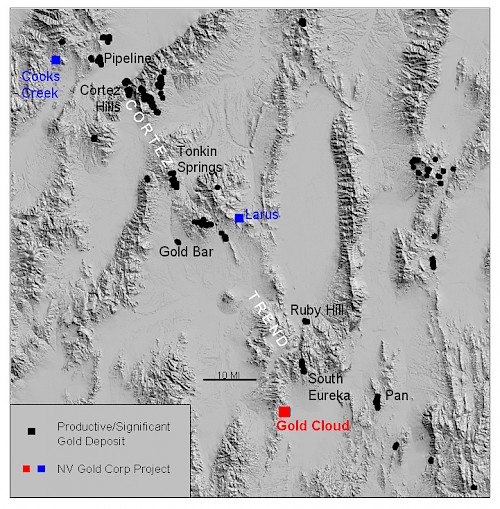 The Gold Cloud Project contains sediment-hosted (Carlin-type) gold mineralization along a range-front fault about 17 miles south of Barrick’s Ruby Hill gold mining operations in the Eureka Mining District. The Project lies along the southeastern part of the Cortez gold belt.